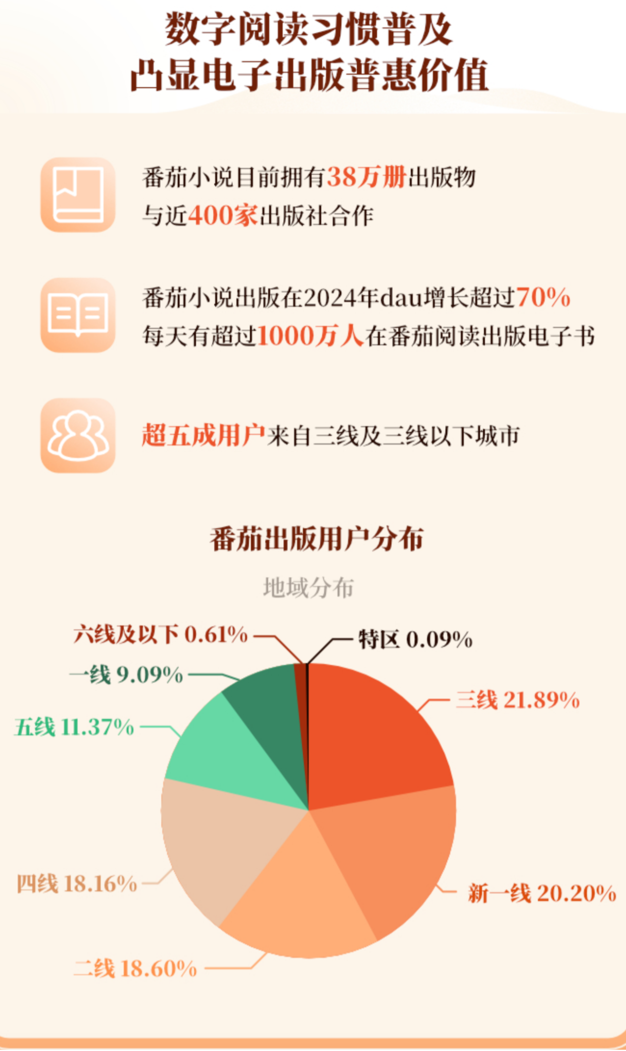 事實(shí)也是如此,以市場(chǎng)上具有代表性的數(shù)字閱讀平臺(tái)番茄小說(shuō)為例,該出版物版塊的日活躍用戶規(guī)模已超過(guò)1000萬(wàn),這些讀者中,三線城市基礎(chǔ)用戶占比達(dá)21.93%,四線城市基礎(chǔ)用戶占比達(dá)18.19%,五線城市基礎(chǔ)用戶占比達(dá)11.31%?!秷?bào)告》認(rèn)為——這些數(shù)據(jù)直觀展現(xiàn)了數(shù)字出版所惠及的龐大用戶規(guī)模及其可觀的活躍度,證明其在推動(dòng)數(shù)字閱讀普惠化方面的成效。