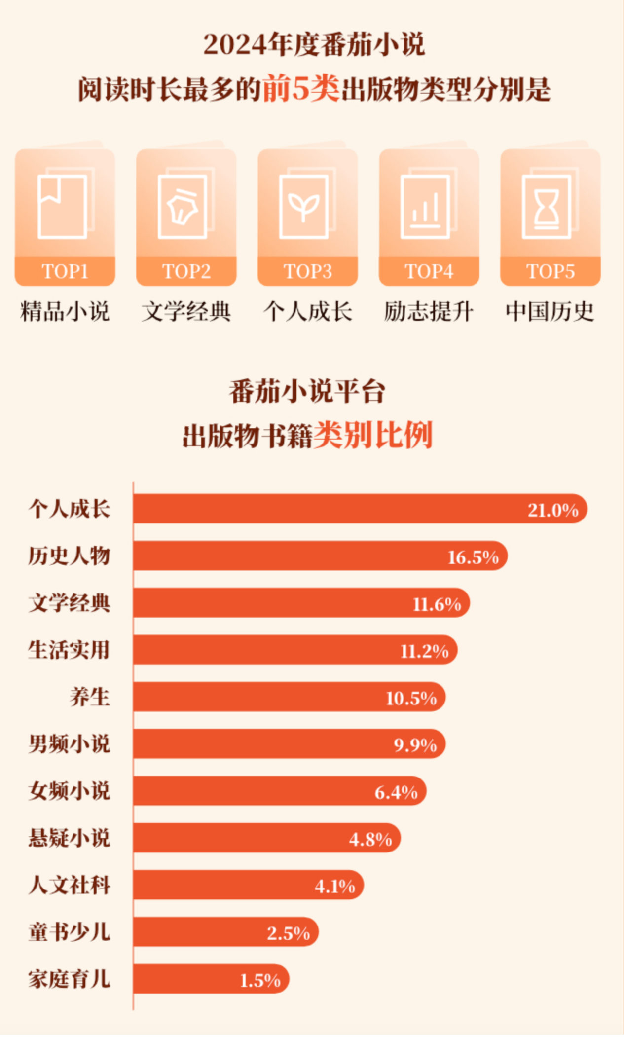 而在閱讀時(shí)長(zhǎng)分布上,精品小說(shuō)、文學(xué)經(jīng)典、個(gè)人成長(zhǎng)、勵(lì)志提升、中國(guó)歷史五類內(nèi)容占據(jù)前五位,反映用戶對(duì)結(jié)構(gòu)化內(nèi)容與知識(shí)型閱讀的需求增長(zhǎng)。