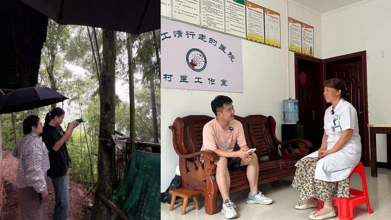 左:調(diào)研團(tuán)隊跟隨村醫(yī)入戶拍攝 右:調(diào)研團(tuán)隊在巫山縣大昌鎮(zhèn)自力村衛(wèi)生室采訪村醫(yī)王元香