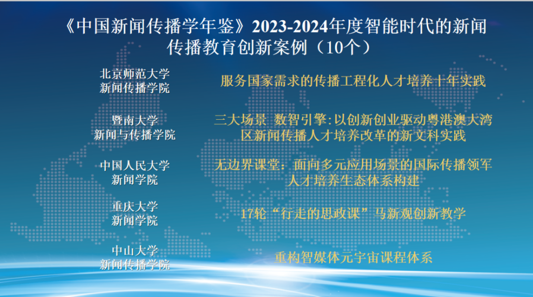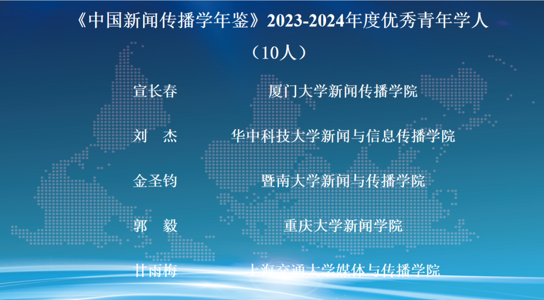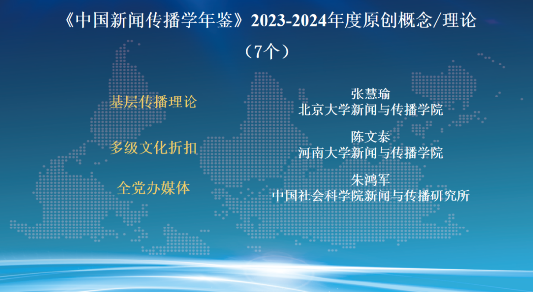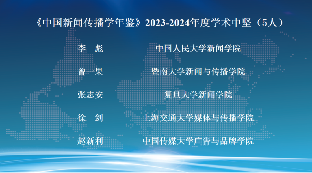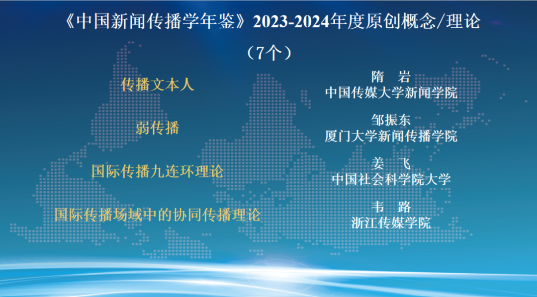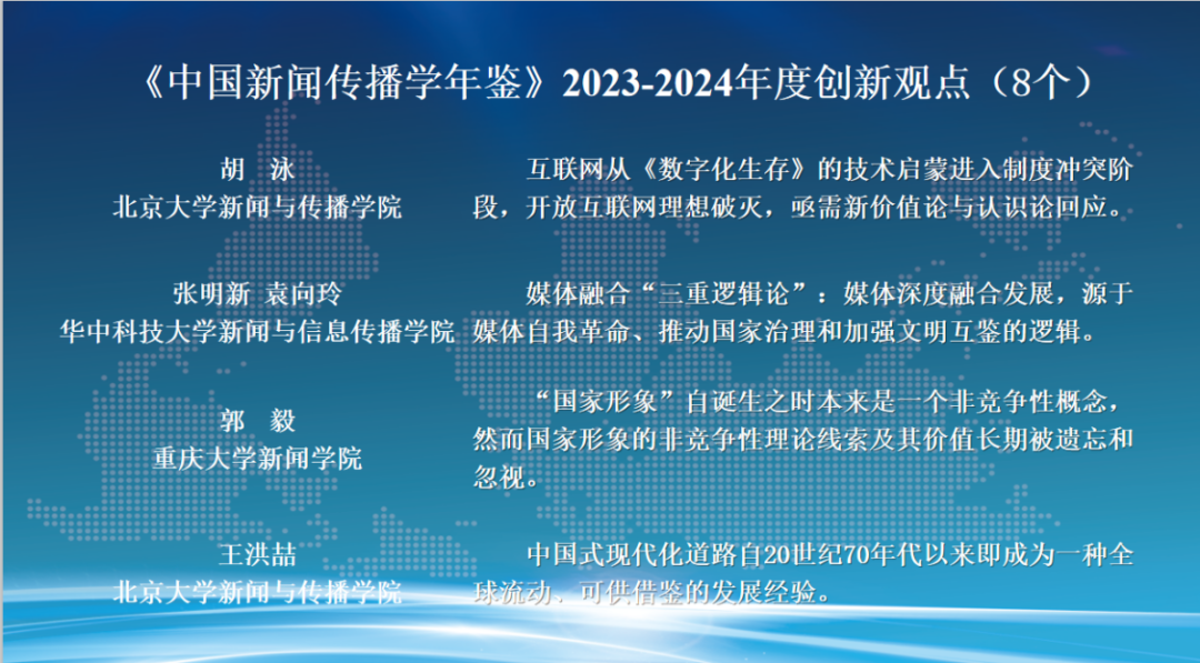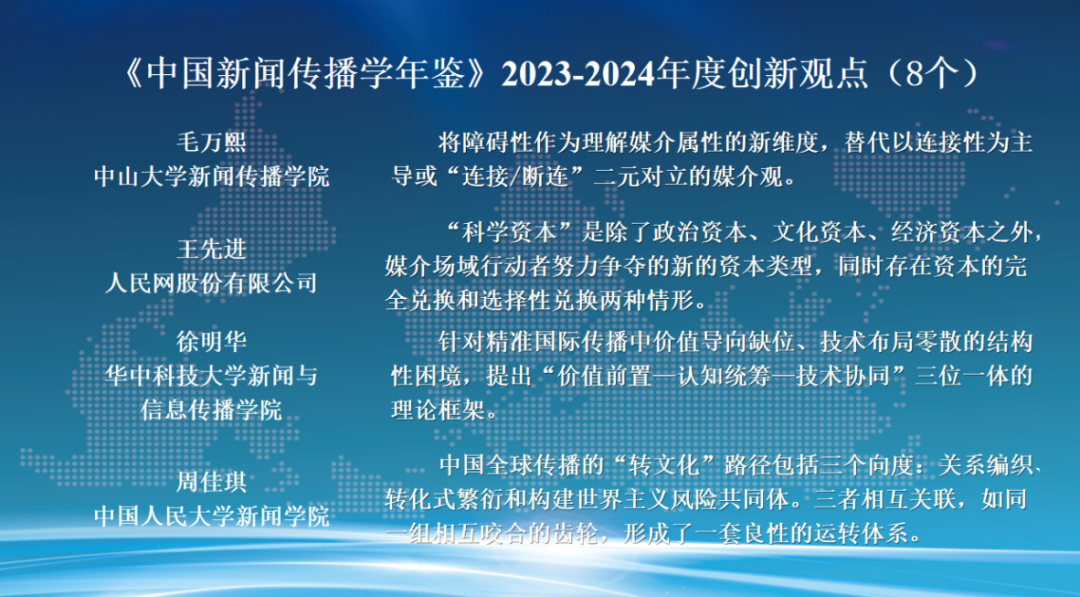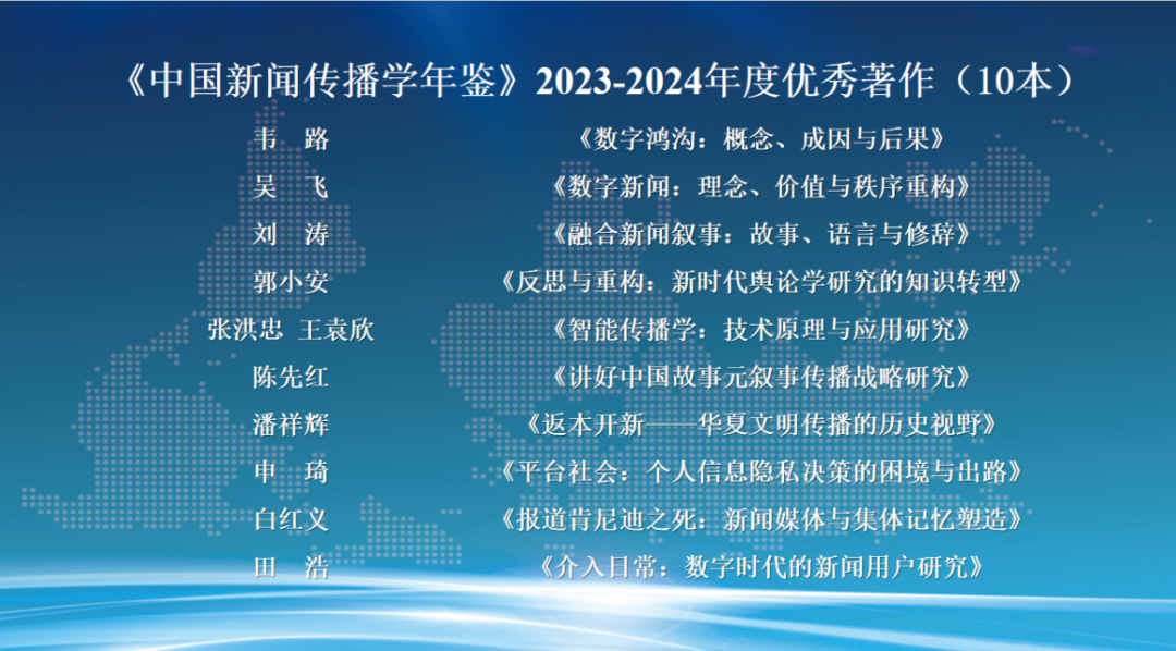 發(fā)布會現場,朱鴻軍宣讀了《中國新聞傳播學年鑒(2024-2025)》關注的年度原創(chuàng)理論/概念、創(chuàng)新觀點、優(yōu)秀專著、優(yōu)秀學人和教育創(chuàng)新案例名單。這份名單的產生經由面向學界征集、15家常務理事單位投票及編輯部統(tǒng)籌平衡等過程,旨在從不同維度反映2023-2024年度新聞傳播學研究的優(yōu)秀成果與學人風采。