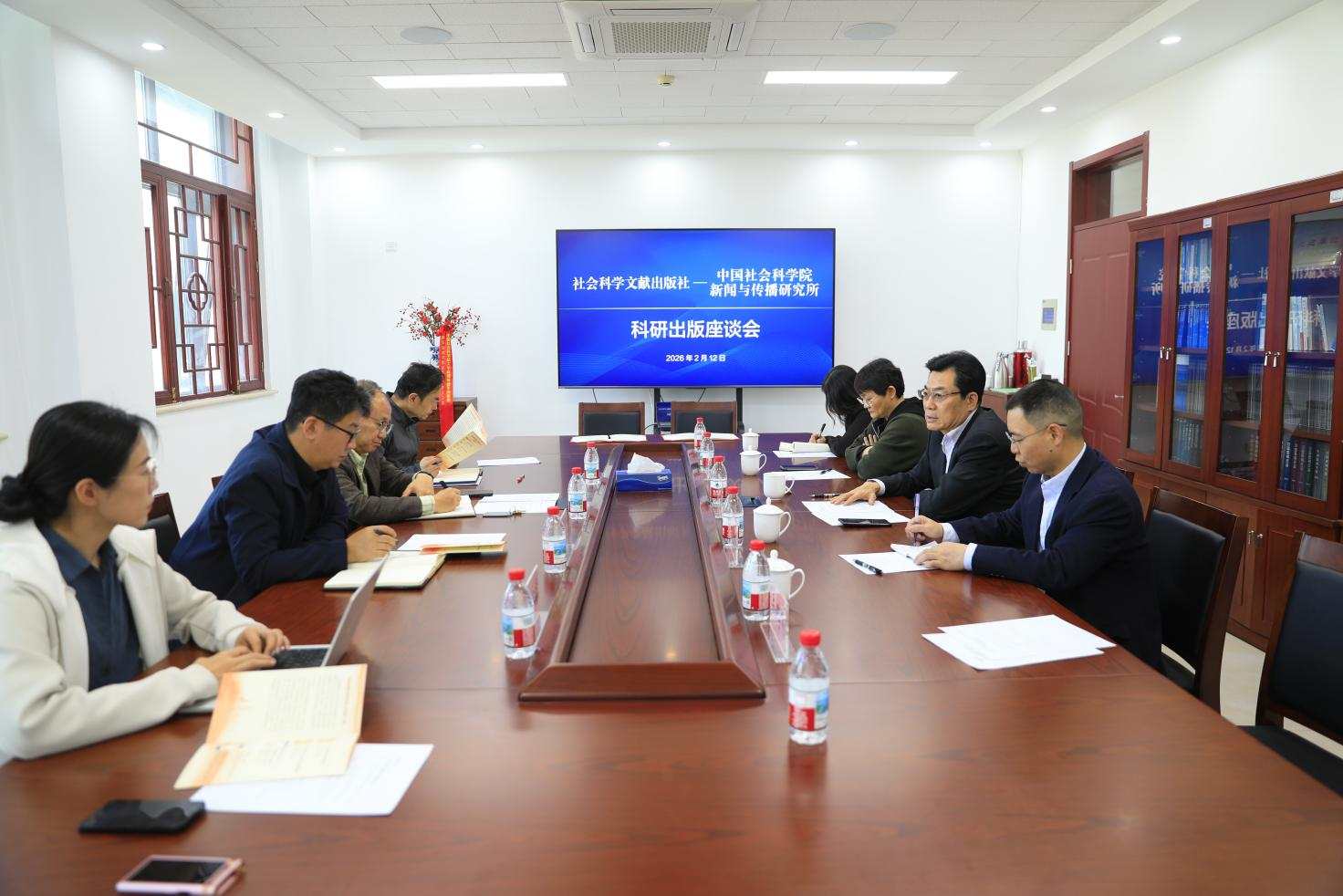 2026年2月12日,中國社會(huì)科學(xué)院新聞與傳播研究所(以下簡稱“新聞所”)與社會(huì)科學(xué)文獻(xiàn)出版社(以下簡稱“社科文獻(xiàn)社”)在新聞所就科研出版合作共建事宜進(jìn)行座談交流。新聞所所長、黨委副書記胡正榮,黨委副書記(主持黨委工作)范承志,科研處處長劉瑞生、青年學(xué)者代表張喆喆博士,社科文獻(xiàn)社黨委書記、社長冀祥德,文化傳媒分社社長祝得彬,國際出版分社社長李延玲,重點(diǎn)項(xiàng)目辦公室常務(wù)副主任兼中國式現(xiàn)代化研究叢書出版工程辦公室副主任孫美子,行政安保部行政主管岳鵬飛參加座談。會(huì)議由新聞所黨委副書記(主持黨委工作)范承志主持。